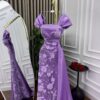 يتميز بتطريز لامع يدوي متداخل برسومات هندسية أنيقة تغطي الجزء الأمامي بالكامل، مع فيونكة ساتان ضخمة عند الصدر تضيف لمسة فخامة وتميز. قصة الفستان ضيقة تُبرز القوام مع ذيل خلفي طويل لإطلالة ملكية. مثالي لحفلات الخطوبة أو حضور مناسبات راقية وسهرات خاصه